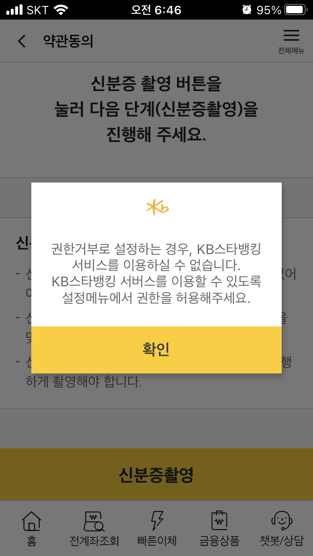 | [문제해결] KB스타뱅킹 사용 중 오류 (권한거부로 설정하는 경우, KB스타뱅킹 서비스를 이용하실 수 없습니다.) (0) | 2021.05.27 |